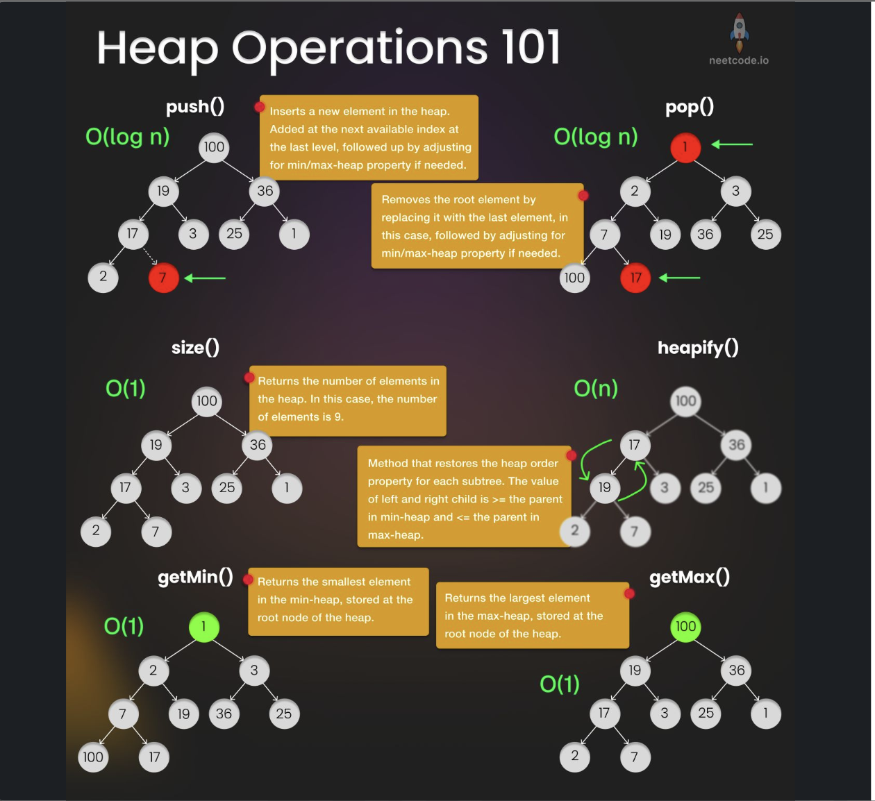 - Functions: heappush, heappop, heapify, nlargest, nsmallest