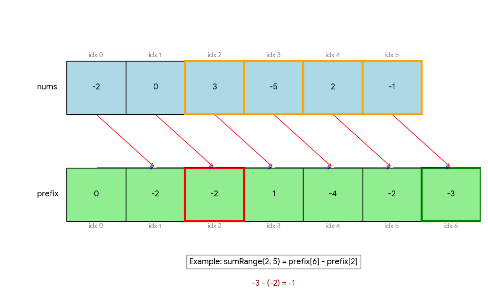 prefixSum[i] = nums[0] + nums[1] + ... + nums[i-1] - Subarray Sum: