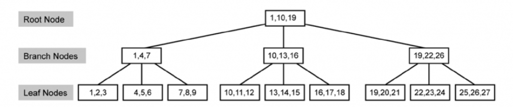 DB hard disk - Use “B-Tree” (Balanced Tree) as data structure with components : Root/intermediate/leaf node