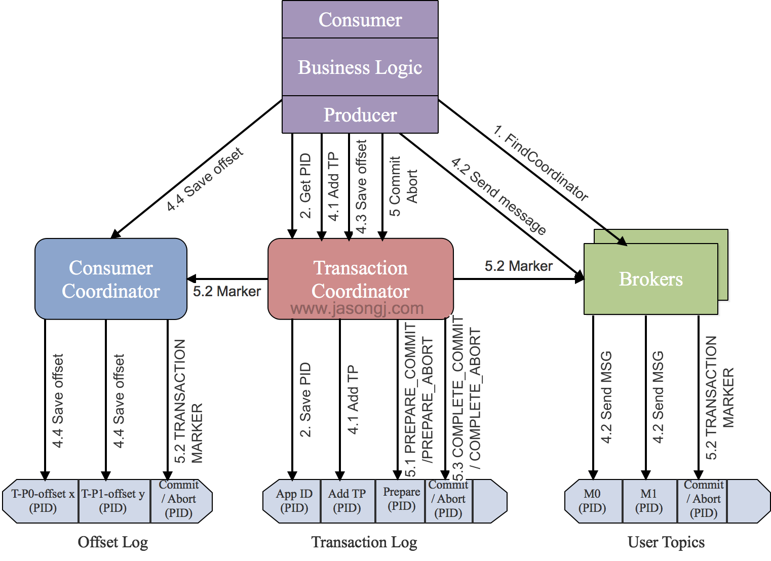 InitpidRequestto TC, gets PID (producer ID), TC will record<TransactionalId,pid>to Transaction Log, state infromation (e.g.Empty/Ongoing/PrepareCommit/PrepareAbort/CompleteCommit/CompleteAbort/Dead) is also included - Commit/Abort non-completed tasks