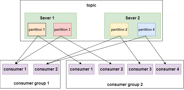 - multiple consumers in same group ~= reading from queue