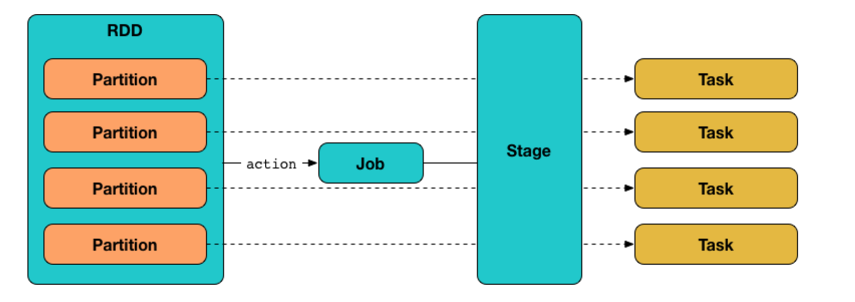 stagecontains as manytasksaspartitionsof theRDD- i.e. partition (part of RDD) -> task (part of stage)