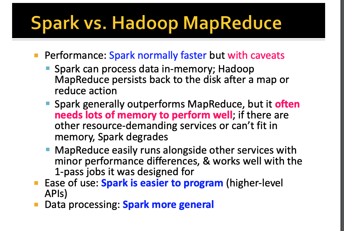 Does save data in memoryasRDDwhen do data op, so that’s why spark is faster than hadoop (since it saves data in memory when do op) (only work when data is not really inlargescale)